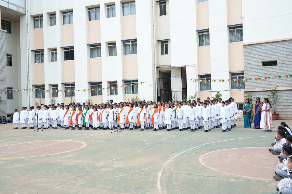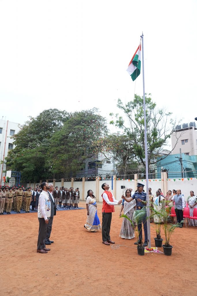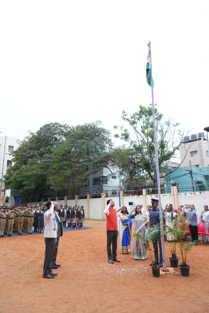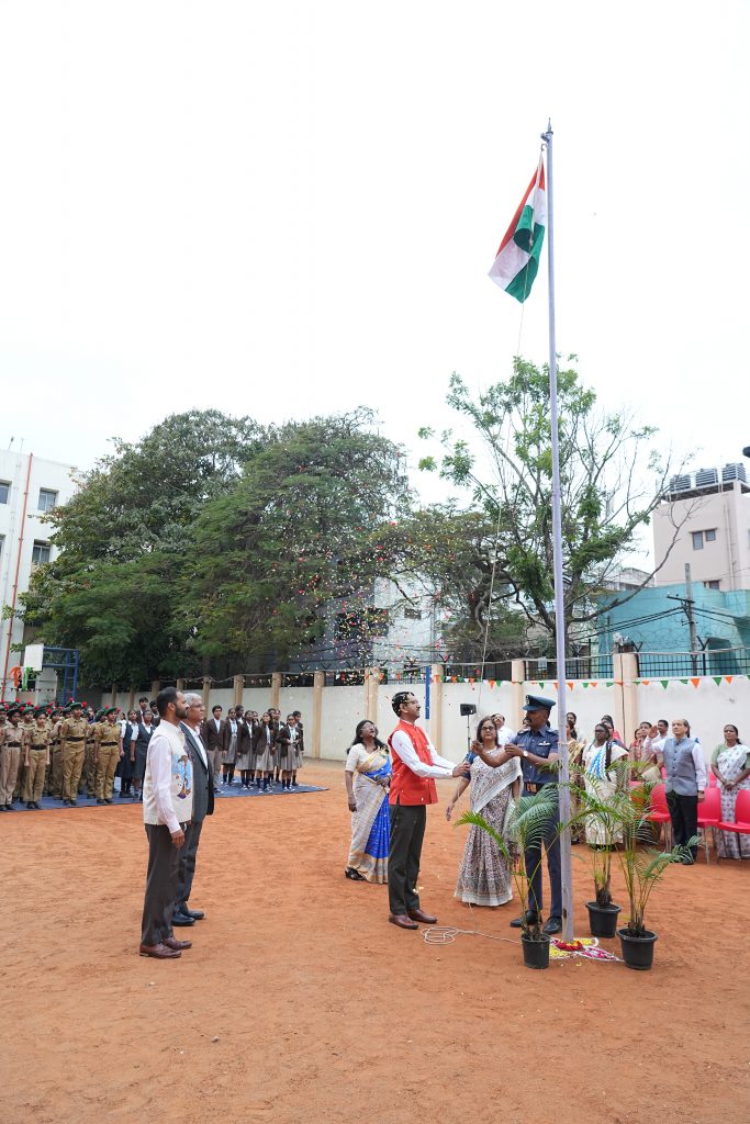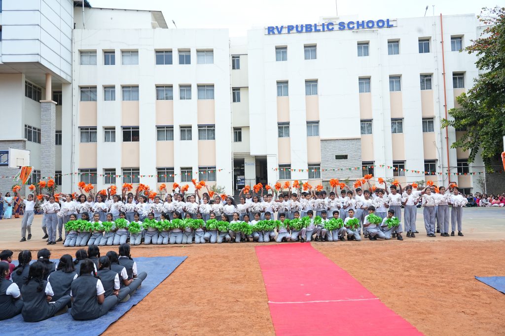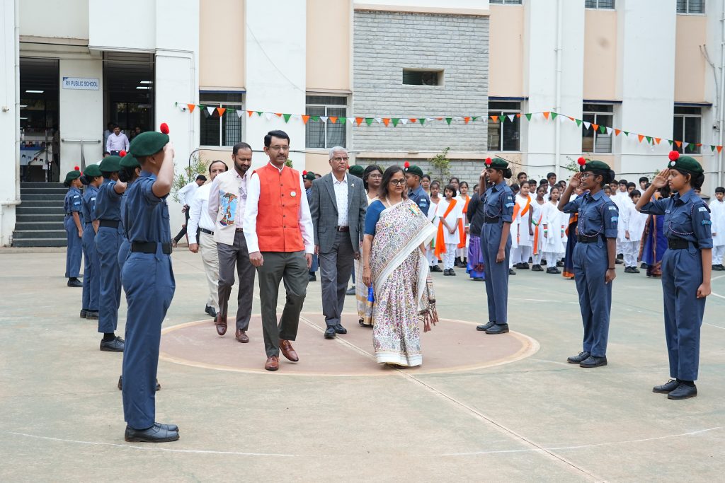 The celebration commenced with the hoisting of the National Flag, followed by the singing of the National Anthem, filling the atmosphere with a deep sense of unity and patriotism. The school was honoured to have Sri. Anantha Lakshmanarao, Associate Director, KPMG, as the Chief Guest, trustees of RSST, HOIs and students of various RV institutions graced the occasion.