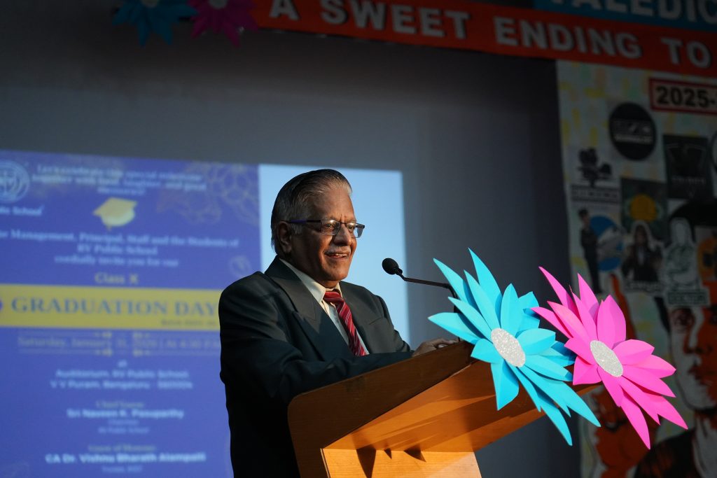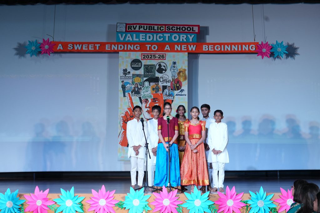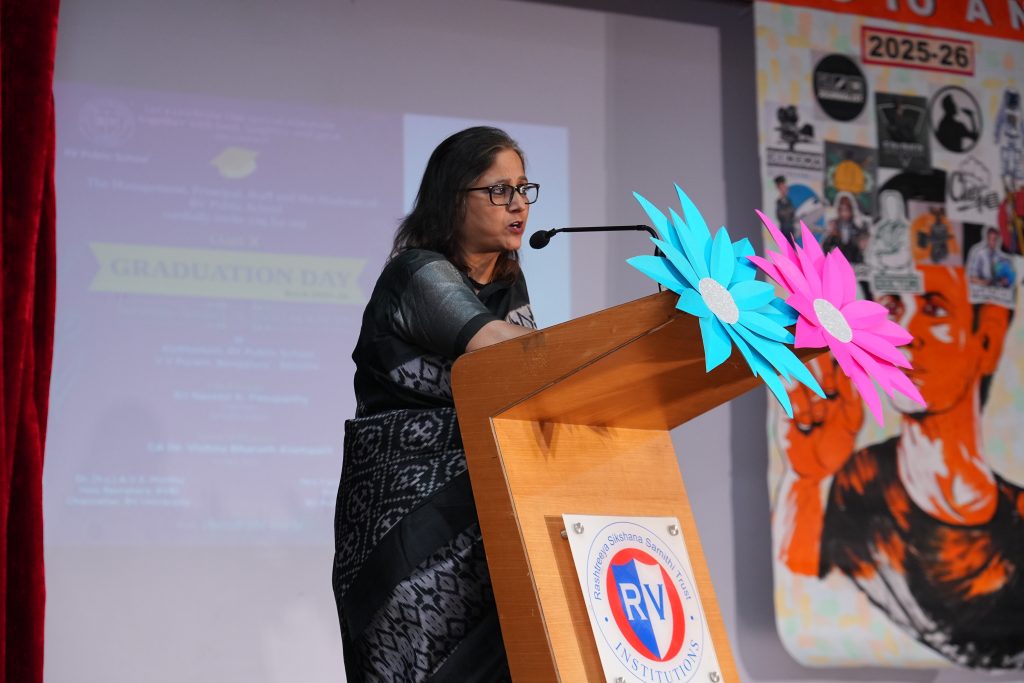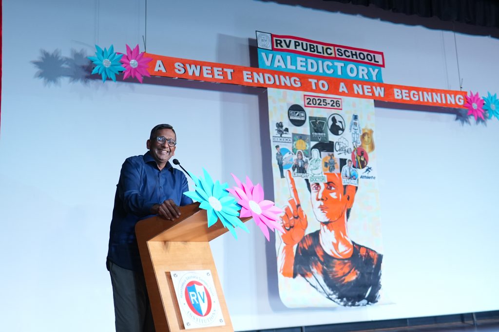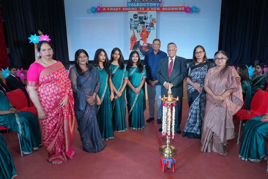 The programme was graced by Sri. Naveen K. Pasuparthy, Chairman, RV Public School, who presided as the Chief Guest. The school was also honoured by the presence of CA Dr. A. S. Vishnu Bharat, Trustee, RVEI, as the Guest of Honour, and Srimati Jyothi Menon, Advisor, RV Public School. Their presence added dignity and significance to the occasion.