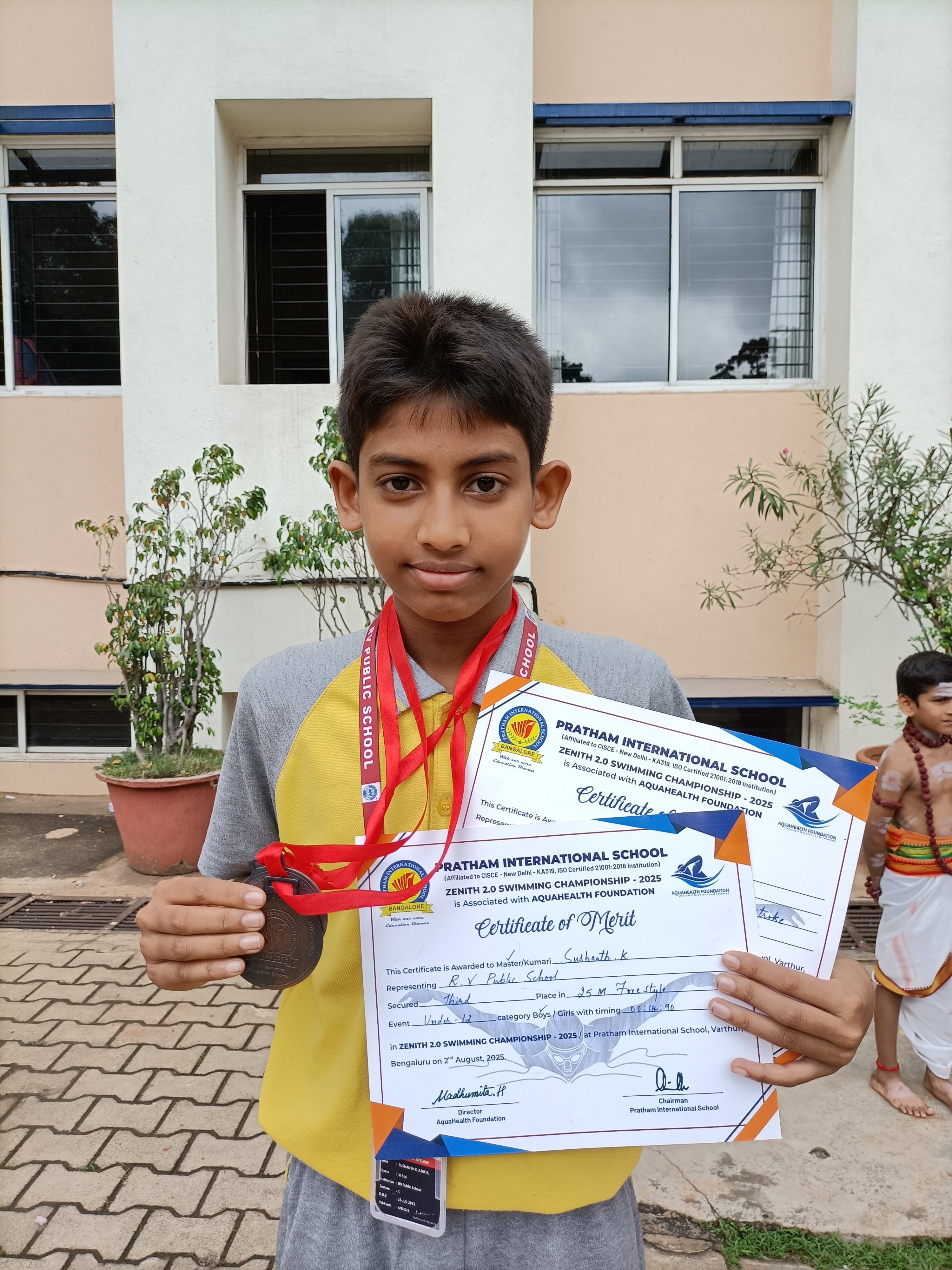 Sushanth K participated in the Zenith 2.0 Swimming Championship 2025 in association with Aqua Health Foundation at Pratham International School on 2nd August 2025 and secured the third position in 25m butterfly stroke and third position in 25m freestyle in the under -12 boys category.