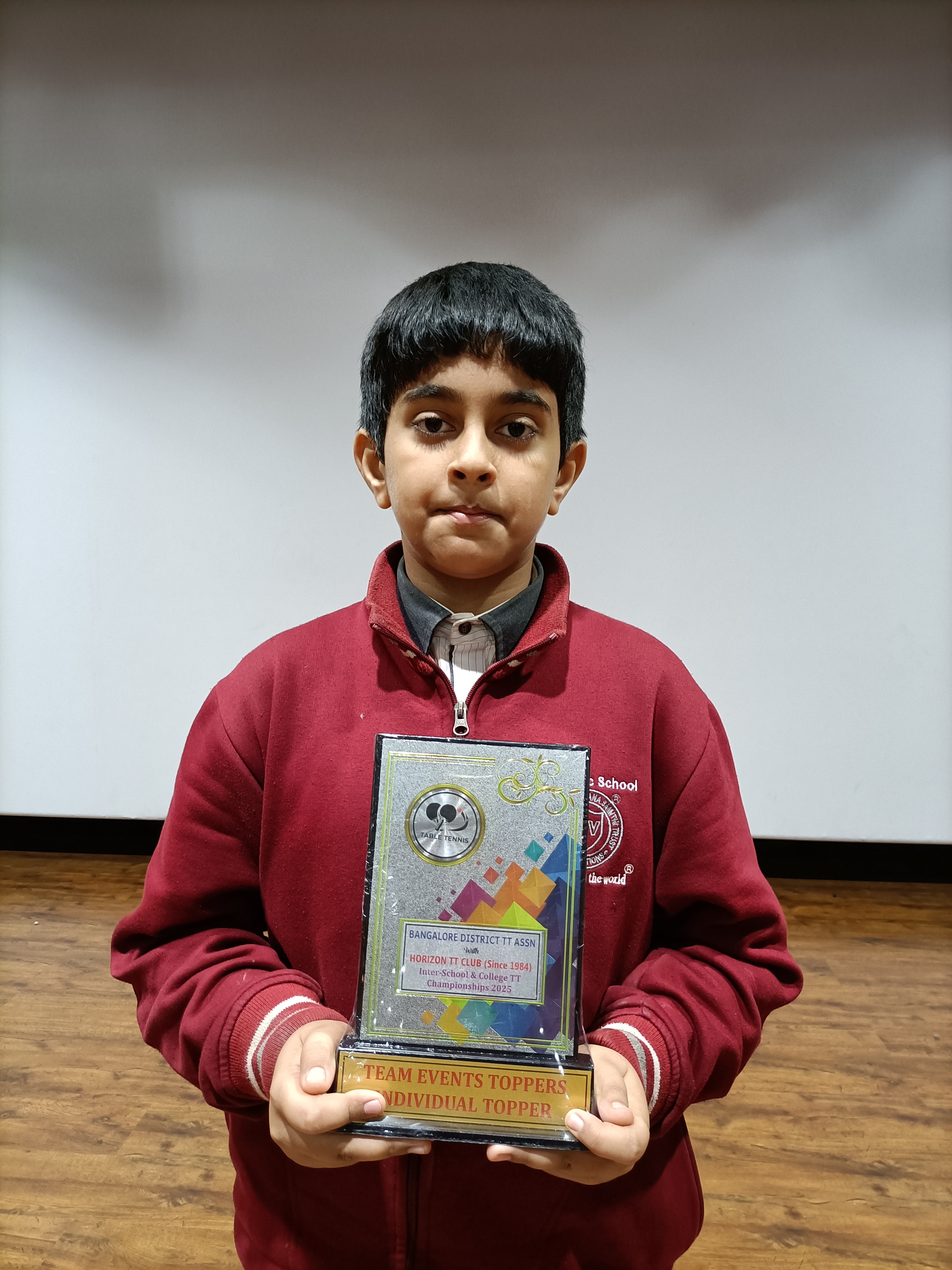 Vismay M Srinidhi of class VI participated in the Inter-school & College Table tennis Championship 2025 conducted by the Bangalore District TT association and won Team and Individual Topper shield.