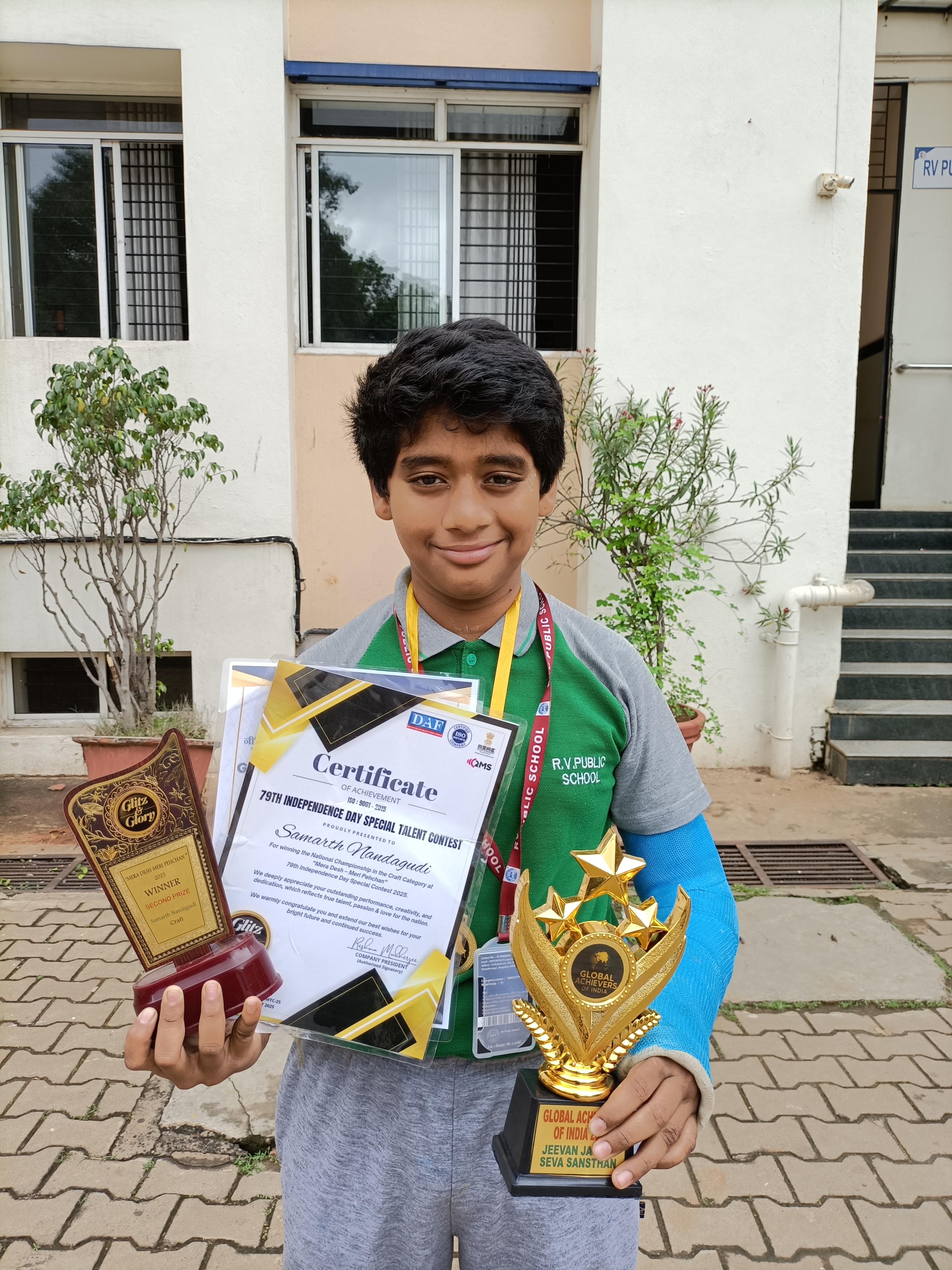 Samarth U Nandagudi of class VIII won the National Championship in the craft category at ‘Meri Desh – Meri Pehchan’ – 79th Independence Dy Special Talent Contest 2025 conducted by Glitz & Glory for his outstanding performance, creativity and dedication which reflects true talent, passion and love for the nation.