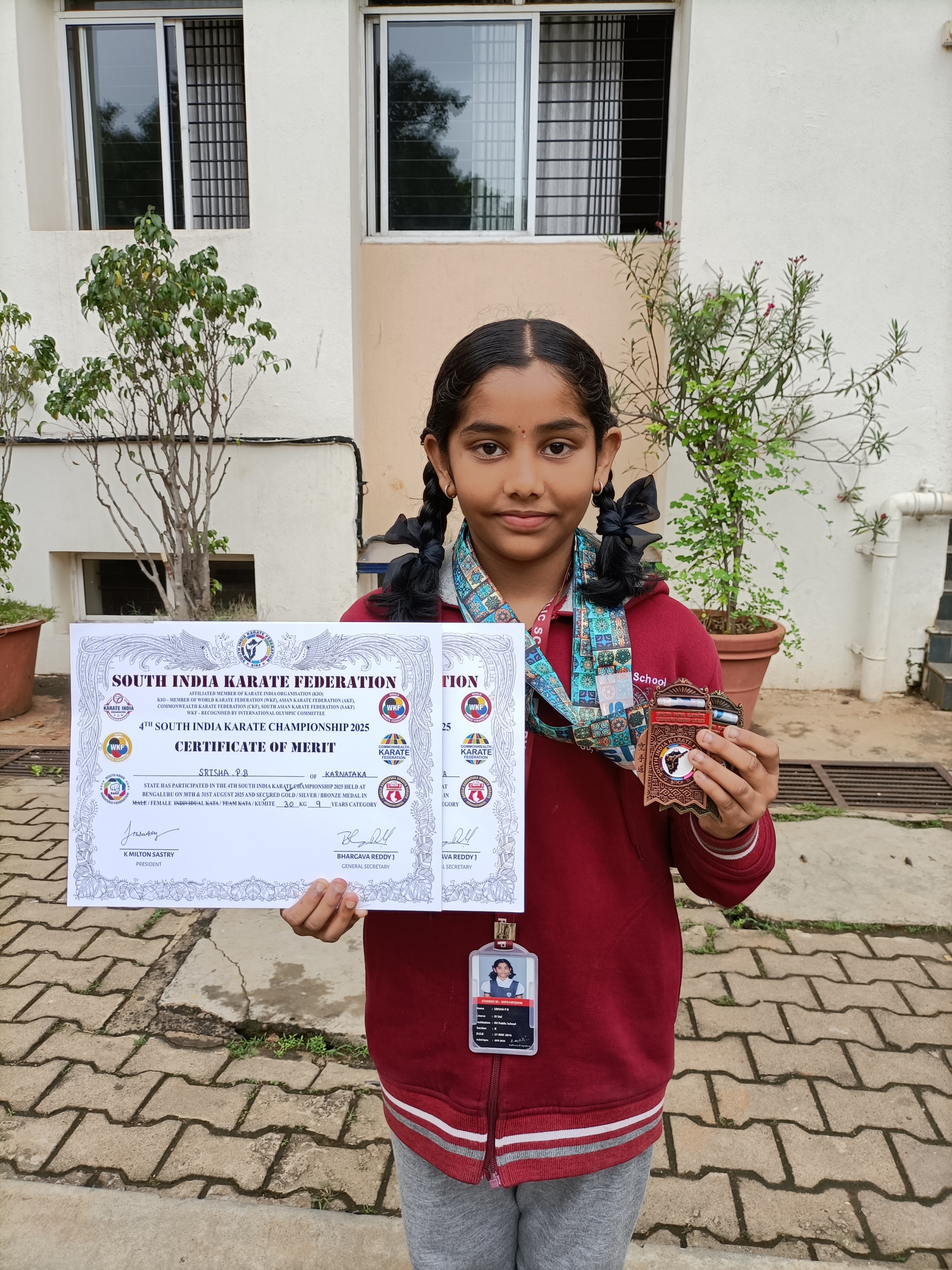 Srisha P B of class V won the second place in under 30 Kg category and the first place in the under 9 years category in the 3rd South India Open Karate Championship 2025 conducted by the CHI – KU – KARATE DO FEDERATION OF INDIA on 10th August 2025.